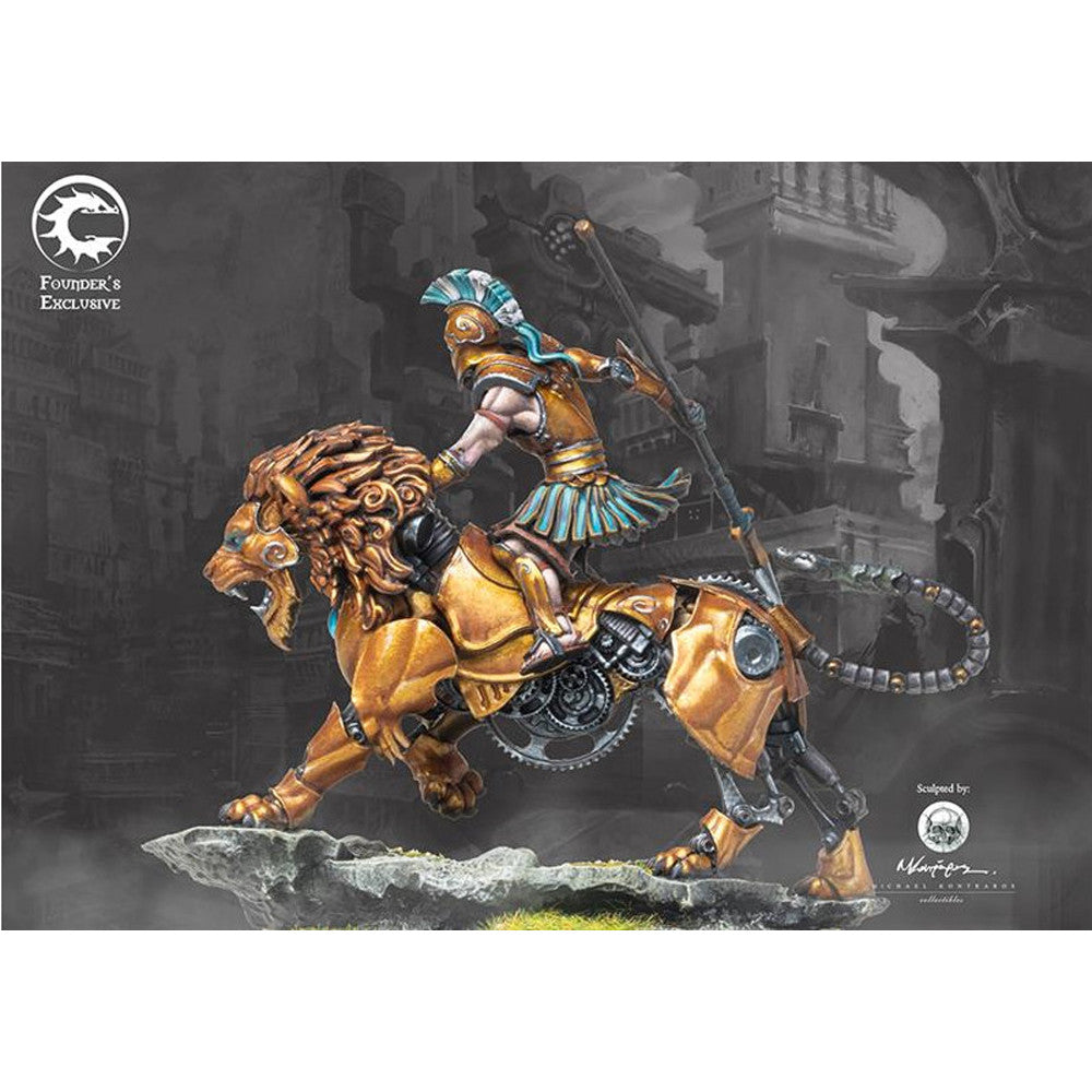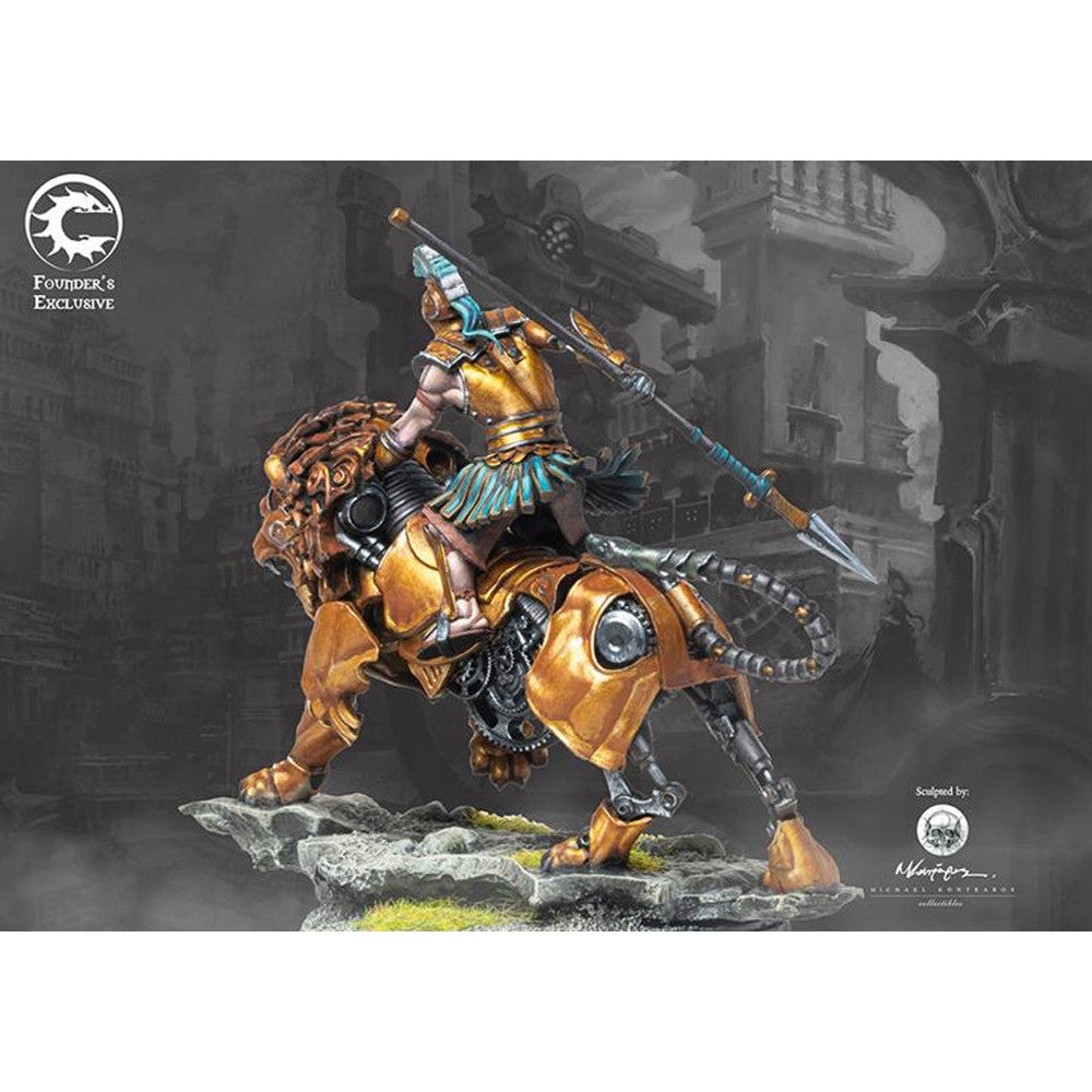 Leontarchos: Lion-hearted, or Lion-souled, are some of the oldest compliments for a brave leader among all cultures of man, predating even the Old Dominion. It is small surprise then that the title of Leontarchos, Lord of Lions, is the highest accolade a City State can bestow upon its leaders. The mechanical marvel that is the phlogiston powered mechanical lion steed he is presented with in recognition of his deeds is almost an afterthought despite being a marvel of human ingenuity and craft. This model is a numbered edition, Founder's Exclusive, limited to 995 total units. This resin model will arrive with a Certificate of Authenticity for the model including it's numbering in the production run. In the game, this will play as an Ipparchos. How the Ipparchos plays: A distinguished officer, the Ipparchos commands the cavalry forces of the City States armies. Capable of deploying a significant contingent of Companion Cavalry to the enemy's flanks and rear, the Ipparchos brings a crucial fast-moving component to any infantry formation.