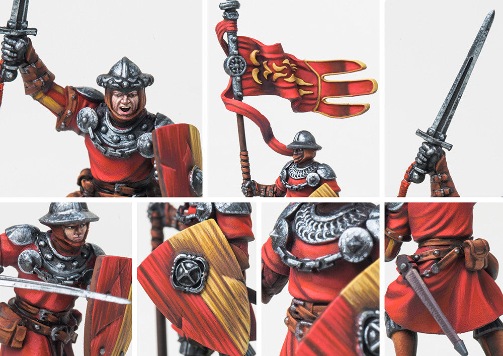 While ranging from ragtag mercenary companies to the well trained and drilled household forces of the major noble houses, constant warfare weeds out the incompetent and duplicitous, making the men-at-arms the backbone of the Hundred Kingdoms war machine. Readily available and reliable the Men-at-Arms act as your army's main battle line - while the more mobile or hard hitting parts of a 100K force encircle and outmaneuver the opponent.