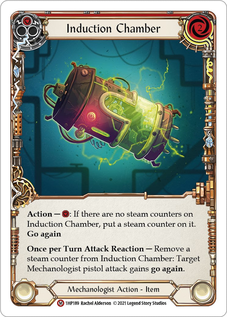 Once per Turn Attack Reaction - Remove a steam counter from Induction Chamber: Target Mechanologist pistol attack gains go again.