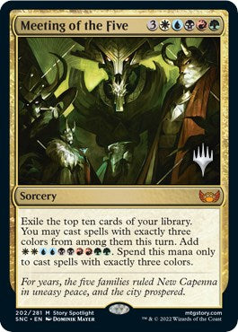 • Rules Text Contains: Exile the top ten cards of your library. You may cast spells with exactly three colors from among them this turn. Add WWUUBBRRGG. Spend this mana only to cast spells with exactly three colors.