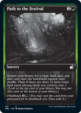 • Rules Text Contains: Search your library for a basic land card, put that card onto the battlefield tapped, then shuffle. Then if there are three or more basic land types among lands you control, scry 1. (Look at the top card of your library. You may put that card on the bottom of your library.) Flashback 4G (You may cast this card from your graveyard for its flashback cost. Then exile it.)