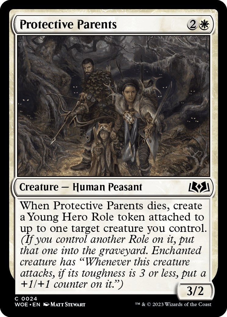 • Rules Text Contains: When Protective Parents dies, create a Young Hero Role token attached to up to one target creature you control. (If you control another Role on it, put that one into the graveyard. Enchanted creature has "Whenever this creature attacks, if its toughness is 3 or less, put a +1/+1 counter on it.")