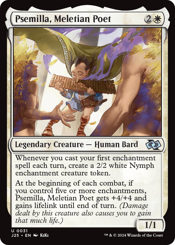 • Rules Text Contains: Whenever you cast your first enchantment spell each turn, create a 2/2 white Nymph enchantment creature token. At the beginning of each combat, if you control five or more enchantments, Psemilla, Meletian Poet gets +4/+4 and gains lifelink until end of turn. (Damage dealt by this creature also causes you to gain that much life.)