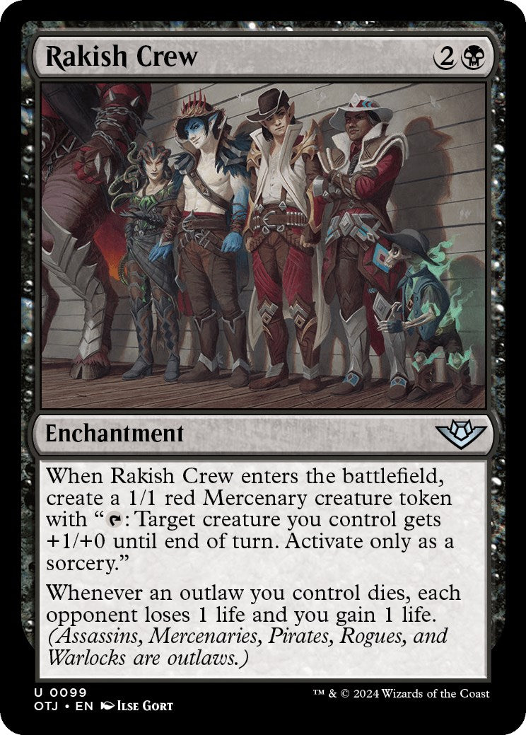 • Rules Text Contains: When Rakish Crew enters the battlefield, create a 1/1 red Mercenary creature token with "T: Target creature you control gets +1/+0 until end of turn. Activate only as a sorcery." Whenever an outlaw you control dies, each opponent loses 1 life and you gain 1 life. (Assassins, Mercenaries, Pirates, Rogues, and Warlocks are outlaws.)