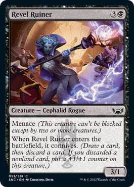 • Rules Text Contains: Menace (This creature can't be blocked except by two or more creatures.) When Revel Ruiner enters the battlefield, it connives. (Draw a card, then discard a card. If you discarded a nonland card, put a +1/+1 counter on this creature.)