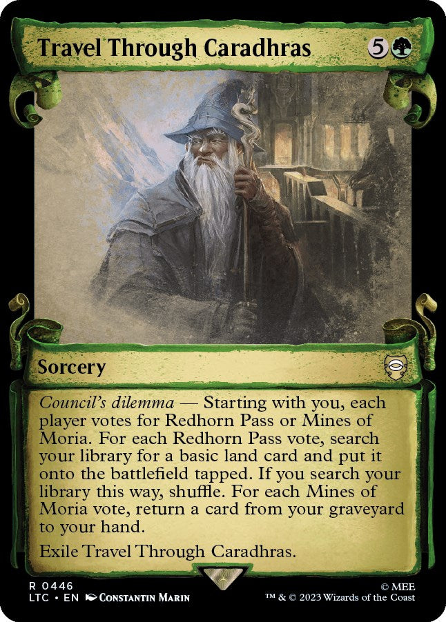 • Rules Text Contains: Council's dilemma — Starting with you, each player votes for Redhorn Pass or Mines of Moria. For each Redhorn Pass vote, search your library for a basic land card and put it onto the battlefield tapped. If you search your library this way, shuffle. For each Mines of Moria vote, return a card from your graveyard to your hand. Exile Travel Through Caradhras.