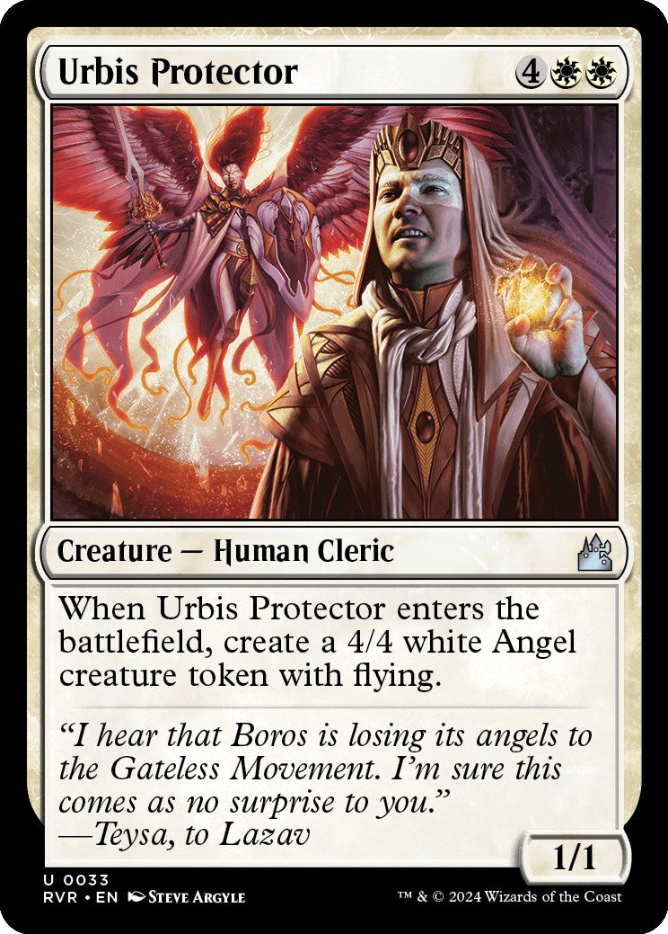 • Rules Text Contains: When Urbis Protector enters the battlefield, put a 4/4 white Angel creature token with flying onto the battlefield.