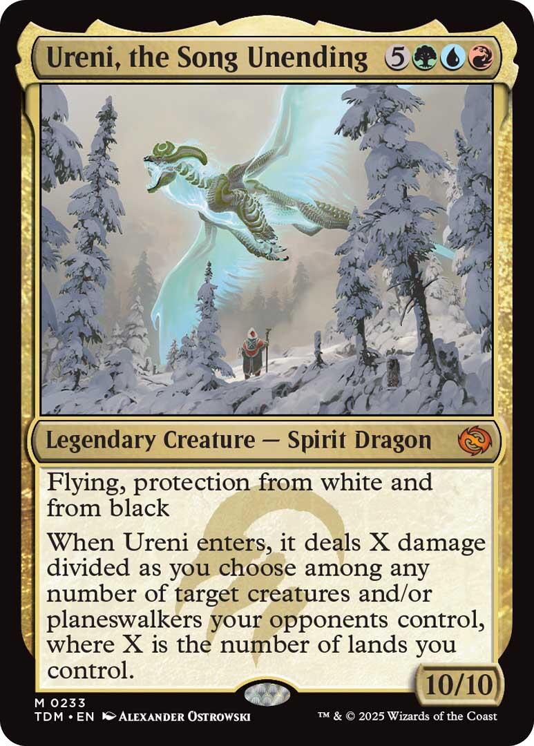• Rules Text Contains: Flying, protection from white and from black When Ureni enters, it deals X damage divided as you choose among any number of target creatures and/or planeswalkers your opponents control, where X is the number of lands you control.