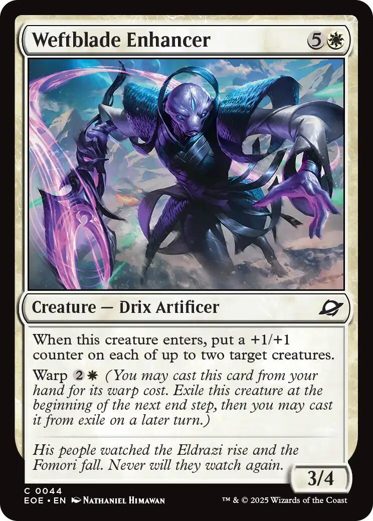 • Rules Text Contains: When this creature enters, put a +1/+1 counter on each of up to two target creatures. Warp 2W (You may cast this card from your hand for its warp cost. Exile this creature at the beginning of the next end step, then you may cast it from exile on a later turn.)