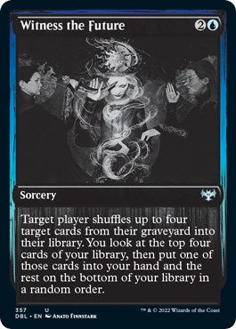• Rules Text Contains: Target player shuffles up to four target cards from their graveyard into their library. You look at the top four cards of your library, then put one of those cards into your hand and the rest on the bottom of your library in a random order.