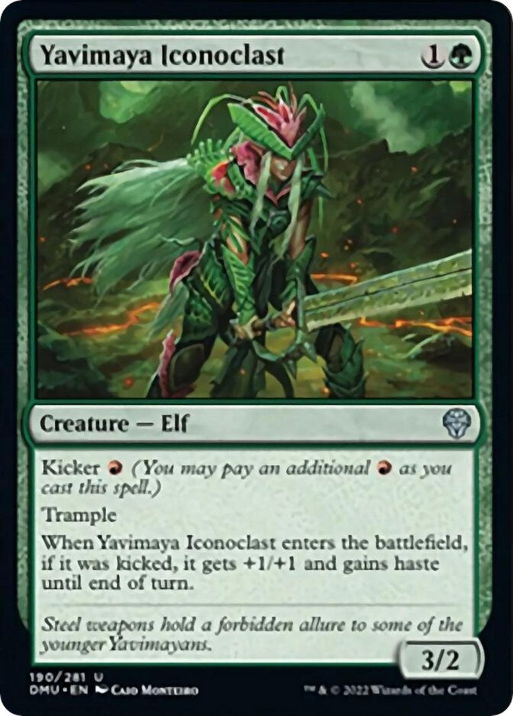 When Yavimaya Iconoclast enters the battlefield, if it was kicked, it gets +1/+1 and gains haste until end of turn.