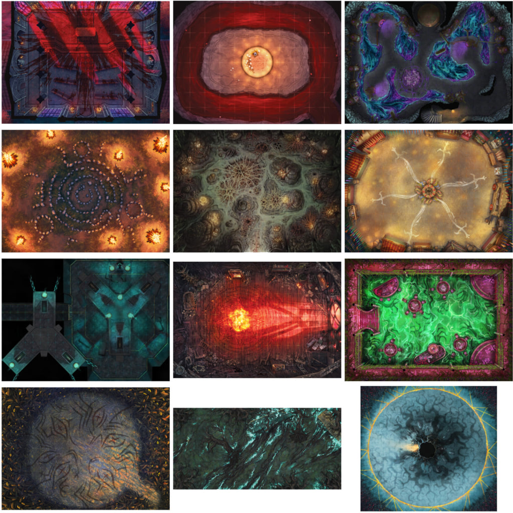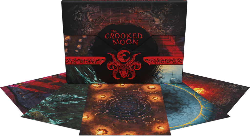 A pack of double-sided poster-sized maps of key locations in The Crooked Moon, each adorned with a 1-inch grid for the ultimate ease of use in any encounter.