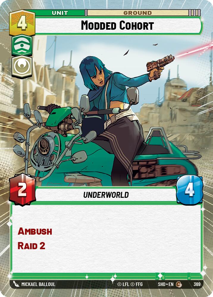 • Description: Ambush (After you play this unit, it may ready and attack an enemy unit.) Raid 2 (This unit gets +2/+0 while attacking.)