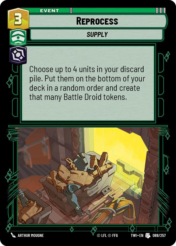 • Description: Choose up to 4 units in your discard pile. Put them on the bottom of your deck in a random order and create that many Battle Droid tokens.