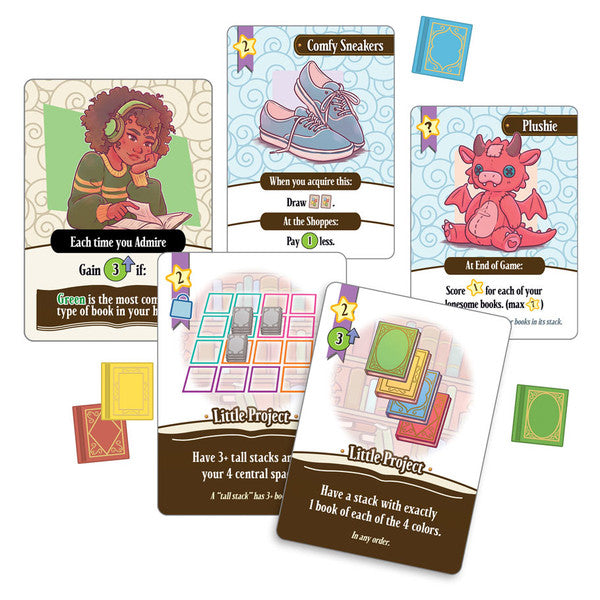 A Place for All My Books is a puzzley book gathering, sorting and organizing strategy game where players arrange stacks of books in different rooms of their apartment as personal projects. When done, they can admire their accomplishments and gain their rewards – not least of which is renewed energy. They can then spend that social battery to leave the house & brave heading out into the village…to pick up more books!