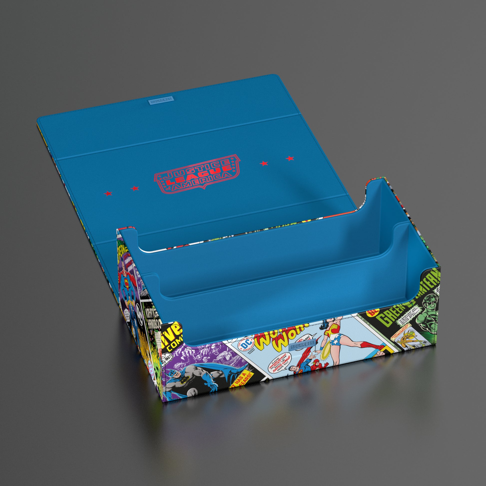 The perfect storage box for TCG decks and trading cards meets legendary comics from the DC Universe! The Collectors Case is the perfect home for up to eight Squaroes from our DC JUSTICE LEAGUE series. But of course it doesn't necessarily have to be Batman, Wonder Woman & Co: This Collectors Case in a unique vintage comic design is also suitable for storing other deck boxes, individual trading cards (up to 1000 in double protective sleeves) or gaming accessories of all kinds. The full-color printed, durable Xenoskin material and the strong magnetic closure with ZnapClaw mechanism also ensure that all contents are kept safe.
